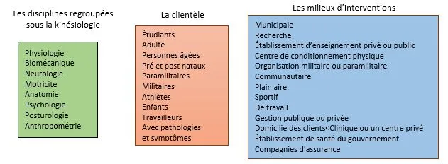 La kinésiologie est constituée de plusieurs disciplines (voir schéma suivant) qui en soi, pourraient de façon indépendante, former une profession (physiologiste, biomécanicien, neuromotricien, etc.). Au Canada, nous avons fait le choix de regrouper ces différentes disciplines dont l’objet d’étude est relié à la locomotion humaine sous toutes ses facettes en une seule entité.