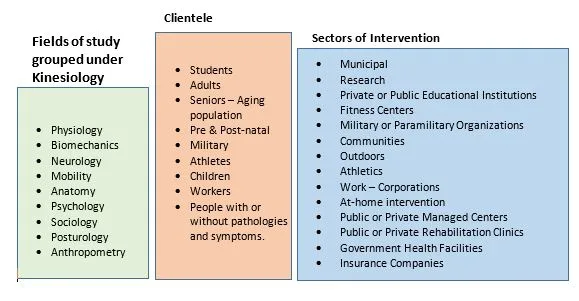 Kinesiology consists of several fields of study that, in their own right, could each form an independent profession (e.g., physiologist, biomechanist, neurologist). In Canada, we have chosen to group together all the professions that focus on aspects of human locomotion.